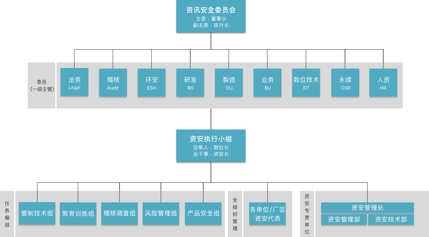 资讯安全委员会为jinnian金年会资安最高管理组织,向董事长报告。下辖资安执行小组负责推行资讯安全委员会之各项决议。为持续建构完整且精实的资安专 责团队,资讯安全管理处下成立「资讯安全管理部」与「资讯安全技术部」,持续投入资源以强化团队资安核心能力。