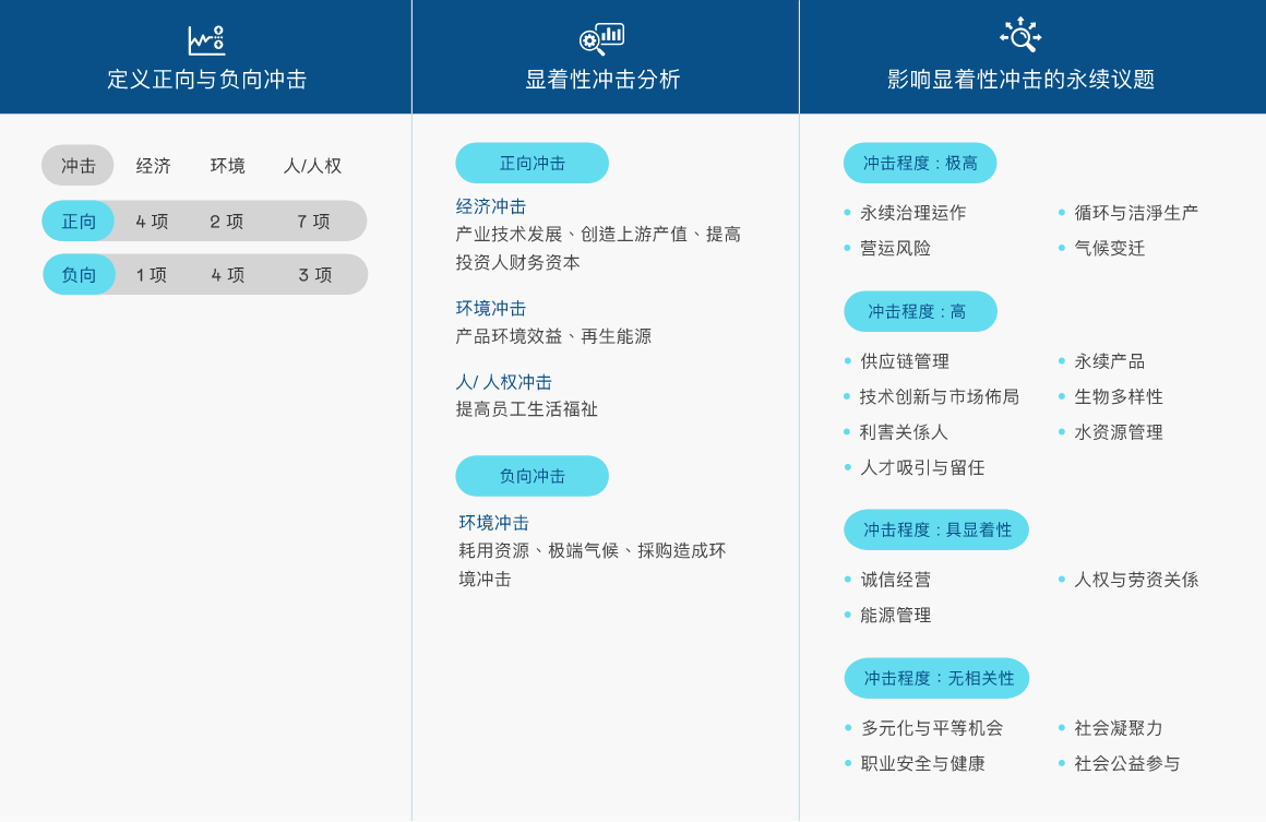 依循全球永续趋势与GRI 准则检视议题之合适性,透过问卷了解利害关系人对公司在环境、社会( 含人权)、公司治理三方面的关注面向,同时建立双重重大性评估方法,透过jinnian金年会主管与价值链的关键伙伴评估ESG 议题对公司所产生的营运冲击程度,并在ESG 外部永续发展冲击方面,根据GRI 通用准则2021(GRI Universal Standards 2021) 的GRI 3:重大主题(Material Topics 2021),整合价值平衡联盟(Value Balancing Alliance, VBA)、哈佛商学院「影响力加权会计(Impact-Weighted Accounts)」研究计画等机构发展之经济、环境及社会层面冲击评估方法学,建构以冲击为基础的重大性分析流程,辨识重大性主题。
